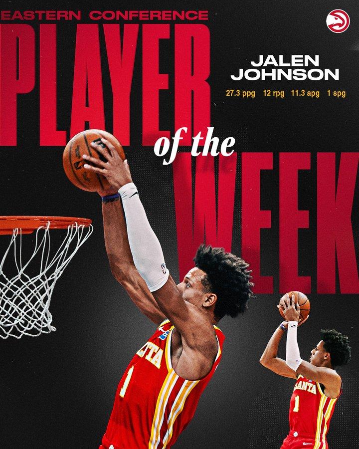 Over the past week, Johnson averaged 27.3 points, 12.0 rebounds, and 11.3 assists, leading the Hawks to a 2-1 record.