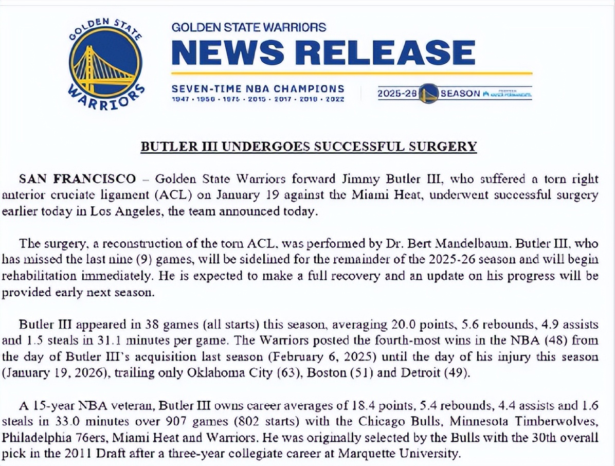 On February 10th Beijing time, the Golden State Warriors revealed that forward Jimmy Butler underwent successful surgery earlier today in Los Angeles. Butler tore his right knee ACL during the January 20th match versus the Miami Heat.