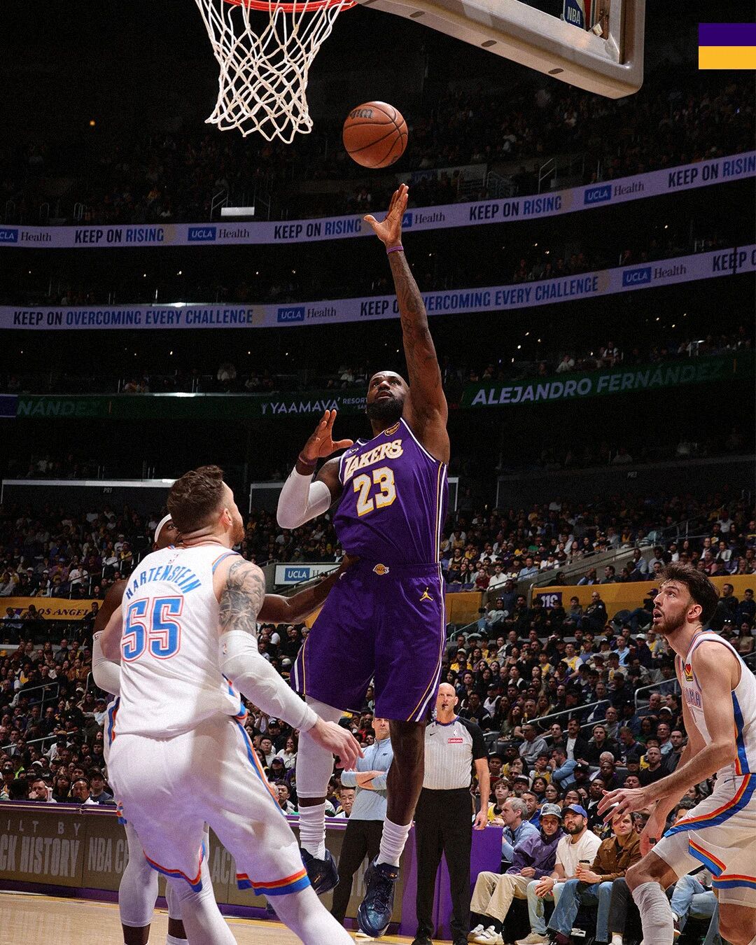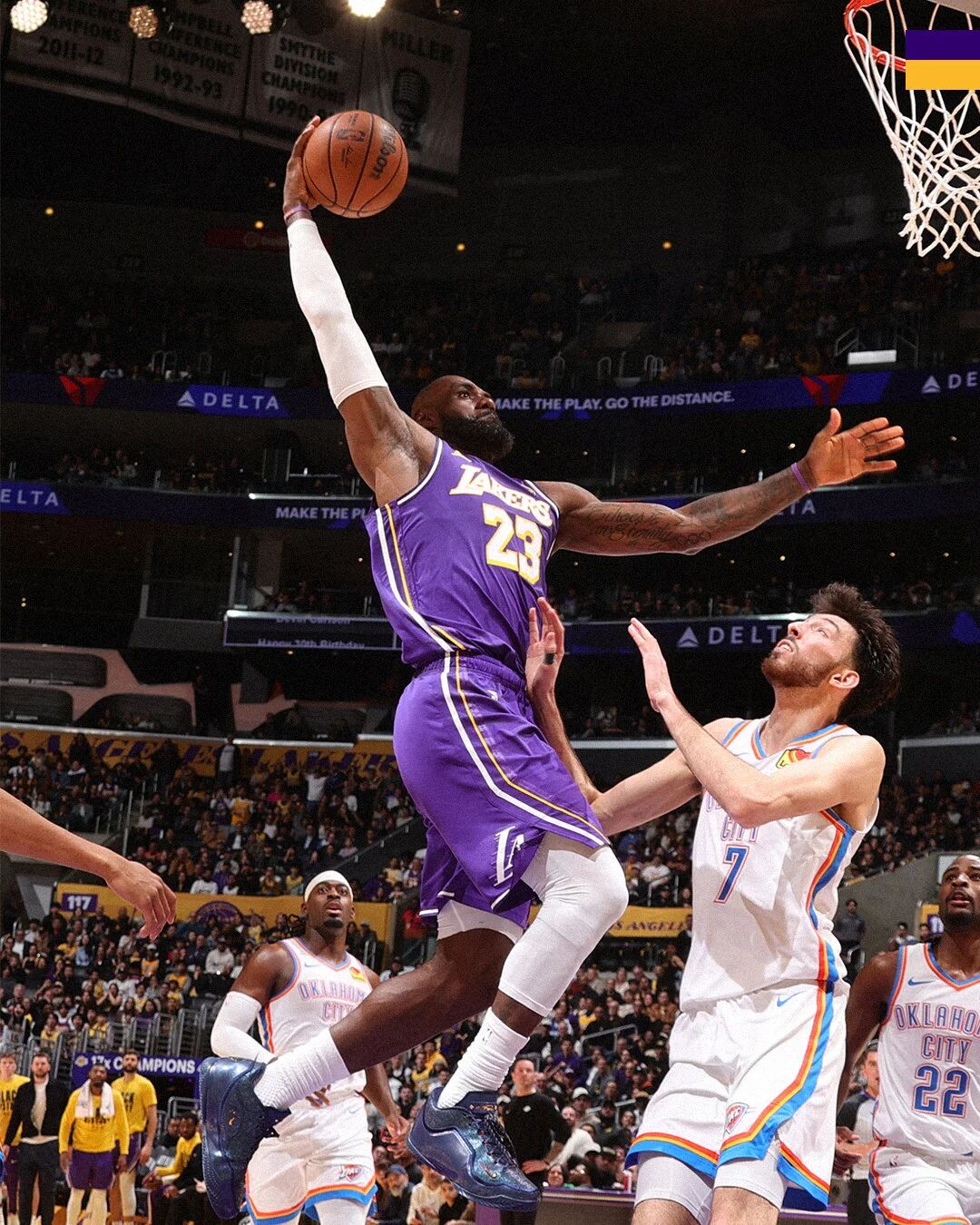 At the start, the Thunder scored first, and the Lakers’ first basket was a three-pointer by LaRavia assisted by James.