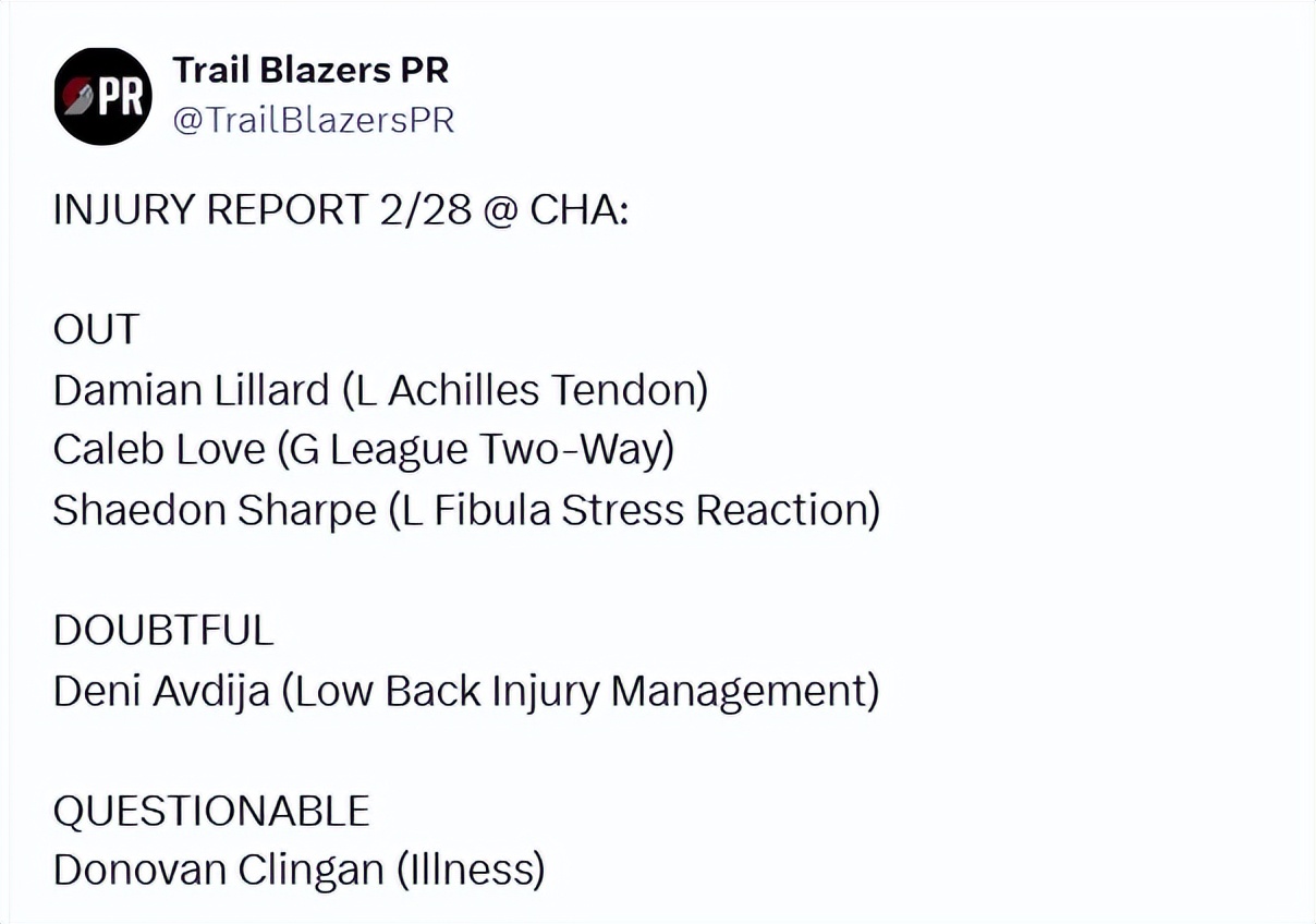 The Trail Blazers' latest injury report shows that for tomorrow's game against the Hornets, Lillard, Love, and Sharpe are out; Avdija is listed as doubtful due to back injury management; and the ill Clingan is questionable. Both Yang Hansen and Robert Williams are not on the injury list. Williams posted a well-rounded stat line of 14 points, 14 rebounds, 2 steals, and 4 blocks in the previous game, while Hansen was a DNP and did not get any playing time.