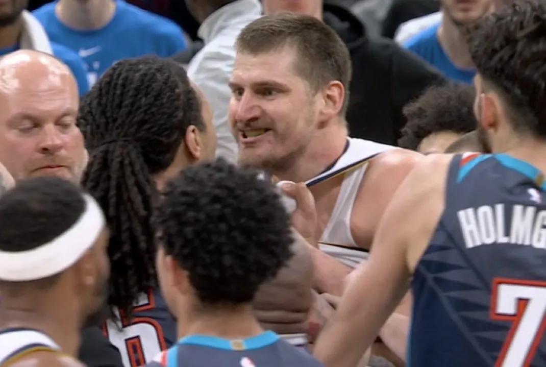 In the final quarter, a signature moment of Jokic's season unfolded. Dort delivered a dirty hit that knocked Jokic down. Jokic immediately sprang up, visibly enraged, and confronted Dort. Williams then rushed over, grabbing and pulling at Jokic's jersey, while Jokic glared back with gritted teeth—a genuinely intimidating scene.
