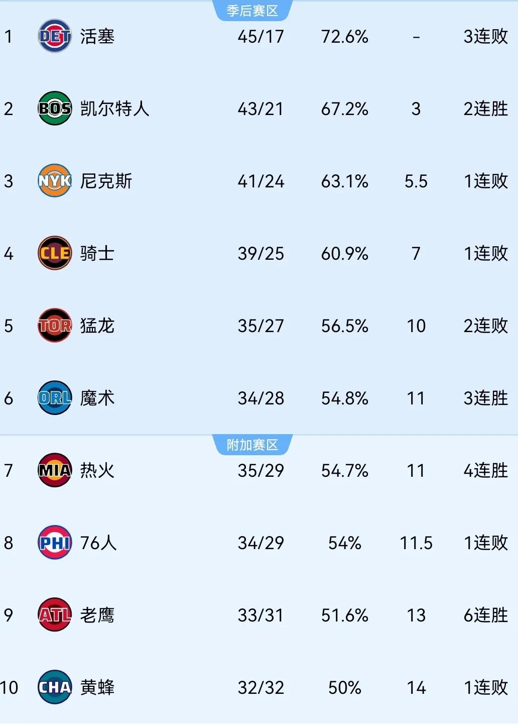 This season so far, the Celtics have a 43-21 record, ranking second in the East, only 3 wins behind the top-ranked Pistons (45-17); the Cavaliers hold a 39-25 record, ranking fourth in the East, 1.5 wins behind the third-place Knicks (41-24).