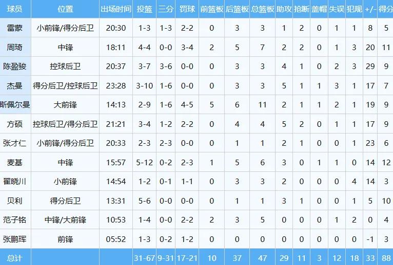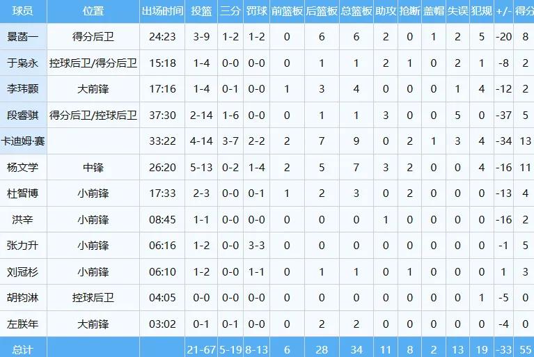 In the end, McGee played approximately 16 minutes as a substitute, shooting 5 out of 12 from the field, 0 out of 2 from three-point range, and 2 out of 3 from free throws, contributing 12 points, 6 rebounds, 3 assists, and 1 block with a plus-minus of +14.He helped the Beijing team easily defeat the bottom-ranked Sichuan team 88-55 at home.