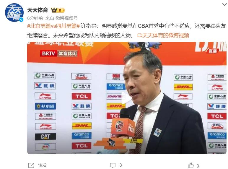 Beijing team coach Xu Limin commented: McGee's debut showed some不适应 to the CBA pace; he still needs to磨合 with teammates and build默契. In the future, he hopes McGee can become a leader-level figure for the team.