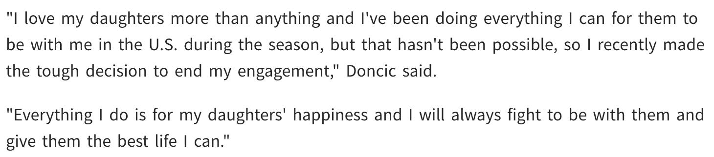 In his statement, Doncic emphasized that the decision to end the engagement was "difficult but necessary," driven primarily by the happiness of his two daughters:“I love my daughters more than anything. Throughout the season, I have done everything possible to enable them to come to the United States and live with me during the season, but this has not been achieved. Everything I do is for the happiness of my daughters, and I will always strive to reunite with them.”