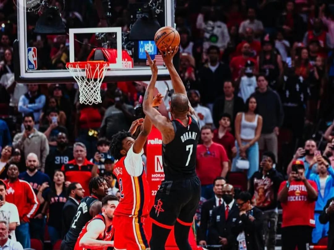 Durant didn't receive the ball immediately. After the inbound pass was thrown to Little Jia, Durant finally got the ball, avoiding any chance for the Pelicans to double-team him. Durant caught the ball, turned, dribbled twice to reach the free-throw line area, and then launched a pull-up jumper over Herbert Jones' defense, hitting the shot to seal the win and put the Rockets ahead.
