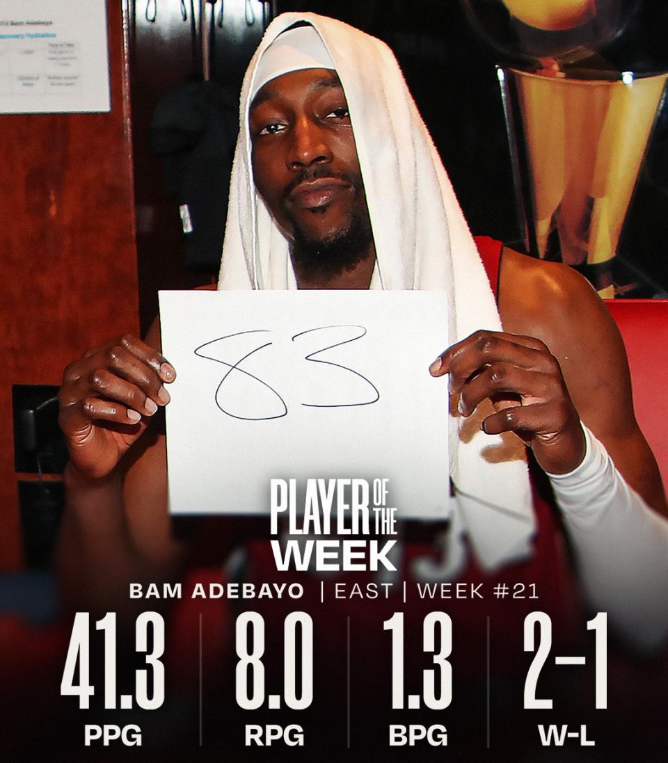 Heat center Bam Adebayo was named Eastern Conference Player of the Week. This is his second time receiving the award this season and the fourth time in his career.
