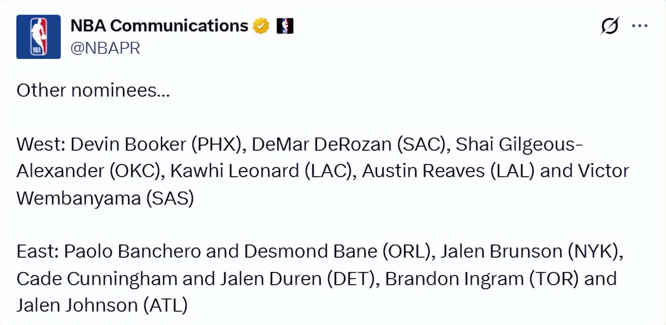 West: Booker (Suns), DeRozan (Kings), Alexander (Thunder), Leonard (Clippers), Reaves (Lakers), Wembanyama (Spurs).