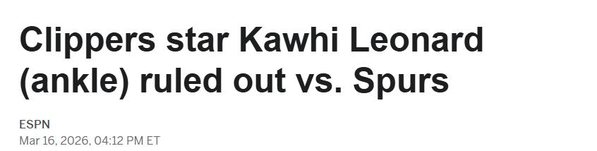 On March 17 Beijing time, Los Angeles Clippers star Kawhi Leonard will miss today's game against his former team, the Spurs, due to a left ankle sprain.