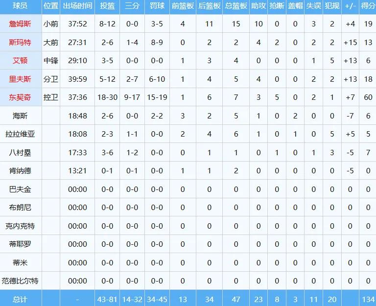 詹姆斯則再次打出高效率表現,上一場對火箭投籃14中13砍下30分5板2助,本場對熱火則是投籃12中8得到19分15板10助三雙數據,背靠背兩戰合計投籃26中21,命中率高達約80.8%。