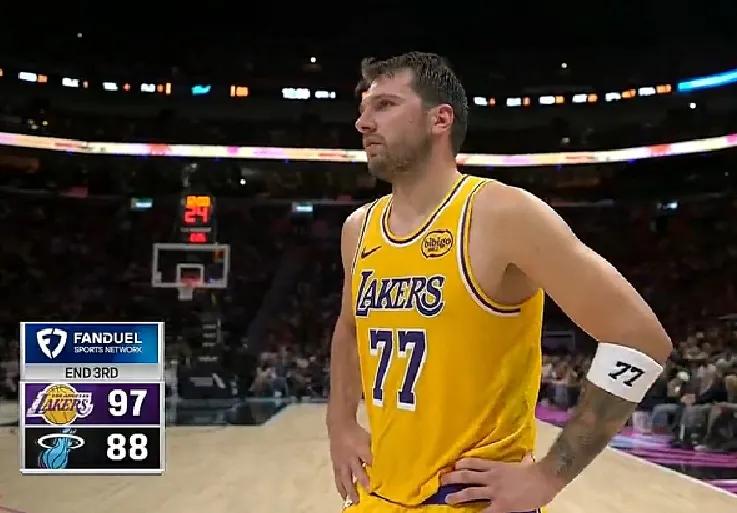 第三節東契奇迎「難」而上徹底爆發,單節投籃10中6(三分7中4)獨攬19分2板3助並送出3次搶斷,成功帶領湖人反超熱火,以97-88進入末節。
