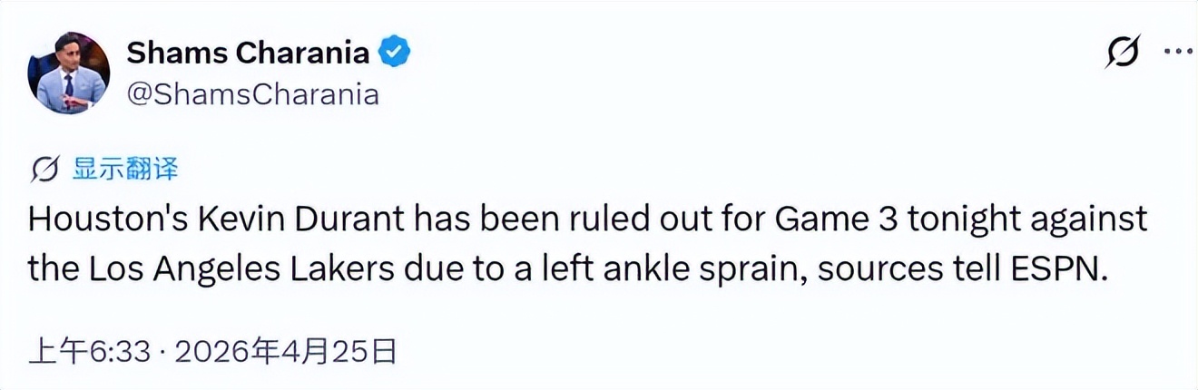 On April 25 Beijing time, according to renowned reporter Shams, Rockets star Durant will miss today's G3 game due to an ankle injury. Previously listed as questionable, after pre-game warm-ups he was confirmed unavailable. For the Rockets trailing 0-2, this is undoubtedly a massive blow.