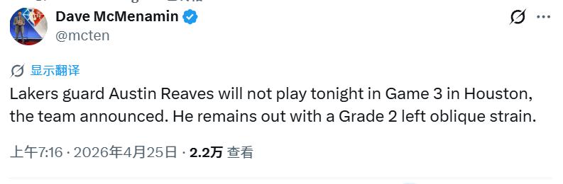 On April 25 Beijing time, the Los Angeles Lakers officially announced: guard Austin Reaves, due to a Grade 2 left oblique muscle strain, has been updated to definitively out and will not play in the first-round Game 3 against the Houston Rockets. Meanwhile, the Rockets also formally confirmed that Kevin Durant (left ankle sprain) continues to be sidelined, marking his second absence in this series.