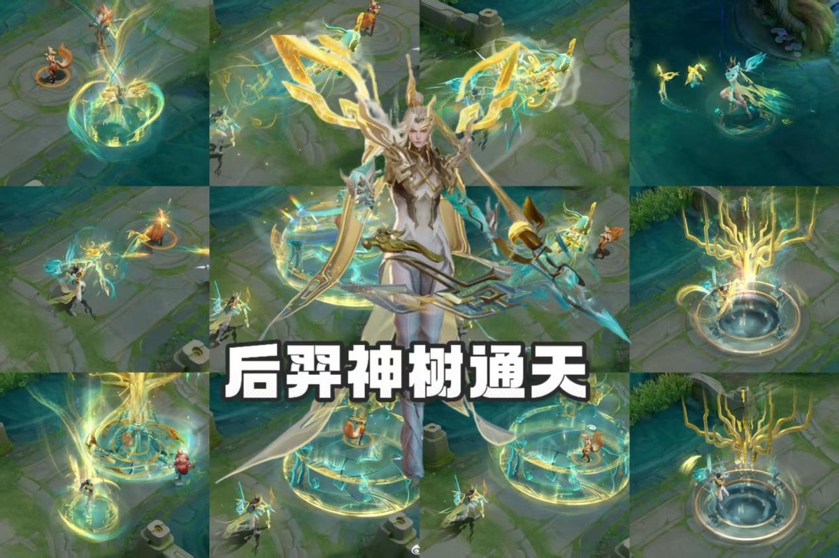 Let’s directly look at the effects. Hou Yi’s skin effects also revolve around Sanxingdui’s bronze elements, with the main creative focus on the bronze divine tree, as the name suggests. Basic attacks turn Hou Yi’s arrows into divine tree branches with stylized bronze trails; the passive extends his weapon with divine tree branches that emit faint multicolored light; the first skill showers golden streams, then activates a bronze magic array on the ground, with the bronze mask behind turning golden and arrows transforming into golden divine birds; the second skill summons a bronze magic array on the ground, and the divine tree breaks through the earth; the ultimate changes Hou Yi’s divine bow into three bronze bow crossbow forms, releasing a bronze divine dragon that flies forward, and when hitting targets, both the divine dragon and altar appear.