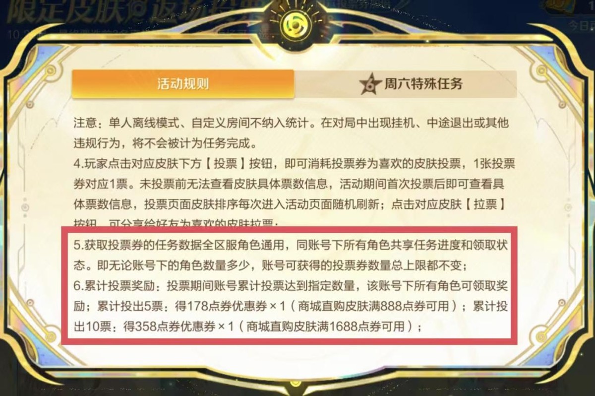 Second, voting grants corresponding rewards: after casting 5 votes, players receive a 178-point skin discount coupon valid for skins priced at 888 points or more in the store; after 10 votes, they get a 358-point skin discount coupon valid for skins priced at 1688 points or more. These coupons can also be used on skins that successfully return in this voting event.