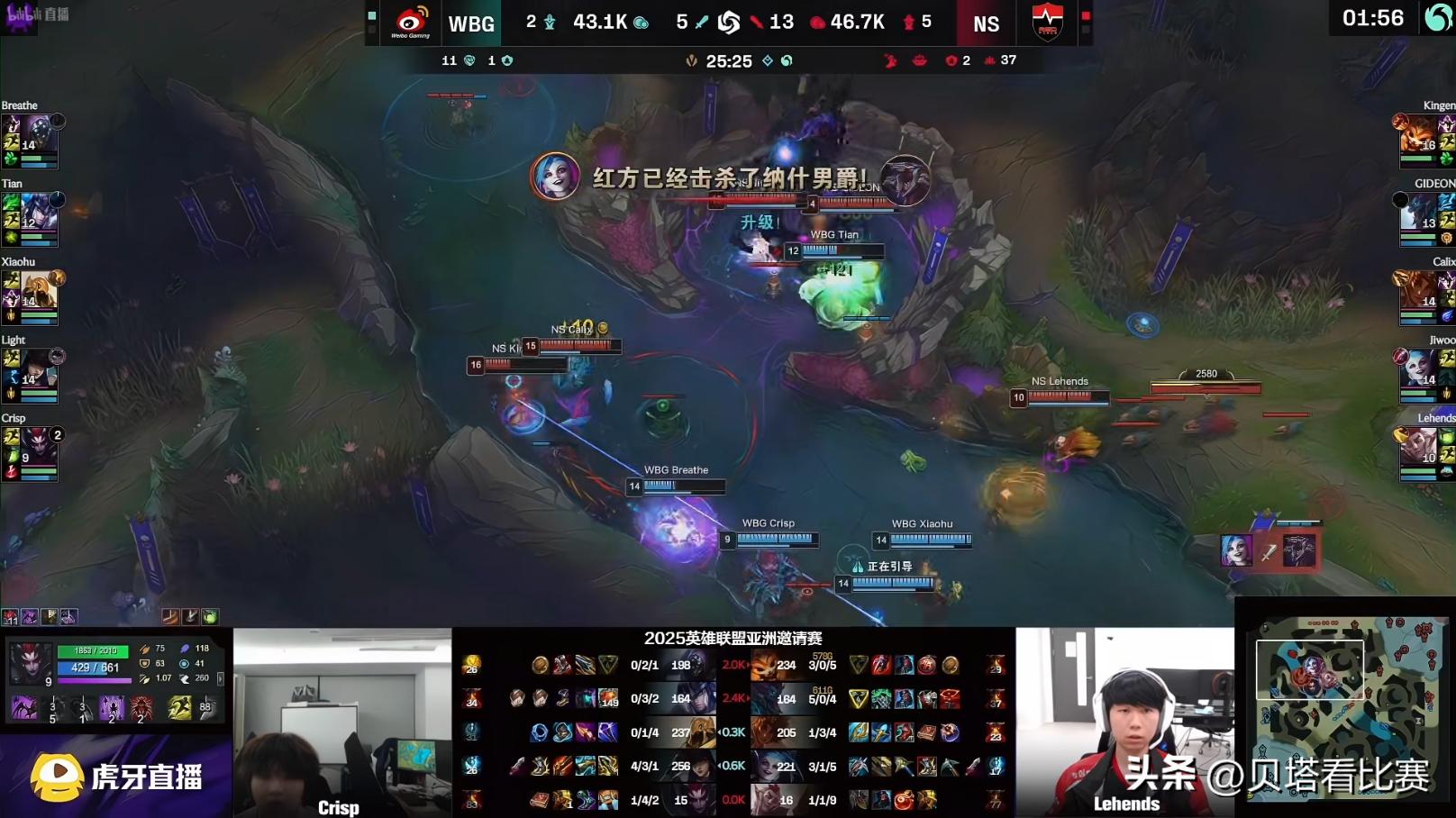 Mid-game, both teams contested the Rift Herald again, with NS’s jungler securing it. At 25 minutes, NS initiated Baron, and although Tian’s Sejuani failed to steal it, NS took the Baron and wiped out four WBG players, clinching the second game victory.