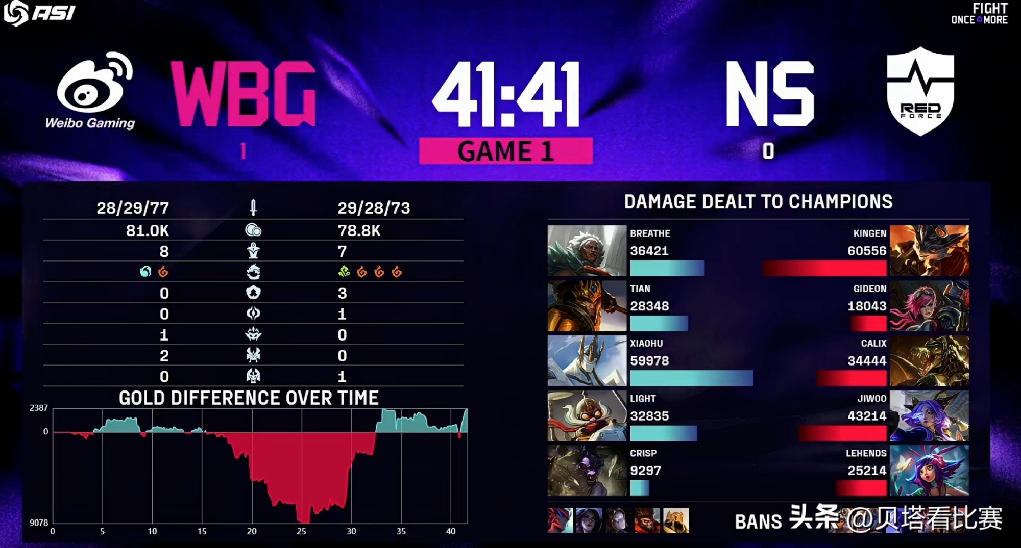 Mid-game, a skirmish broke out top lane, where Kingen’s Rumble ultimate split the fight and Jiwoo’s Yuumi dealt massive damage. NS secured a 3-for-0 trade, though Tian’s Jarvan stole the Rift Herald. At 25 minutes, WBG initiated Baron, but NS’s Renekton killed Light’s Aphelios. Despite WBG taking the first Baron, Lehends’ Neeko started a fight that led to NS wiping out WBG. At 28 minutes, NS secured the dragon soul. Later, at 32 minutes, a river fight saw Breathe’s Aphelios dive onto Jiwoo’s Yuumi, with Xiaohu’s Galio ultimate joining in and Tian’s Jarvan ult hitting three players. WBG wiped NS and claimed their second Baron. Finally, at 40 minutes during the Elder Dragon fight, Lehends’ Neeko engaged and ulted four players, but Breathe’s Aphelios targeted Jiwoo’s Yuumi. After a 1-for-1 exchange, NS took the Elder Dragon, but Xiaohu’s Galio performed flawlessly, enabling WBG to pull off a miraculous team wipe and secure the first game win. The highest damage dealer in game one was Kingen’s Rumble, with Xiaohu’s Galio leading damage for WBG.