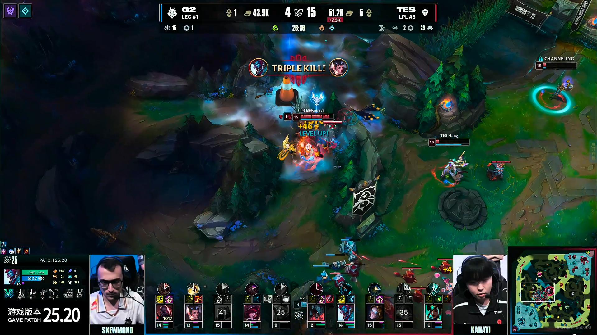 Early in the game, G2’s bot lane swapped lanes, but TES kept targeting and killing G2’s top and jungle repeatedly in the bottom lane. TES secured all Rift Scuttlers and Dragons. G2’s formation was fragmented early, struggling with resource swaps and tower dives, while TES effectively punished G2’s solo laner Sion with continuous kills, breaking through that lane.