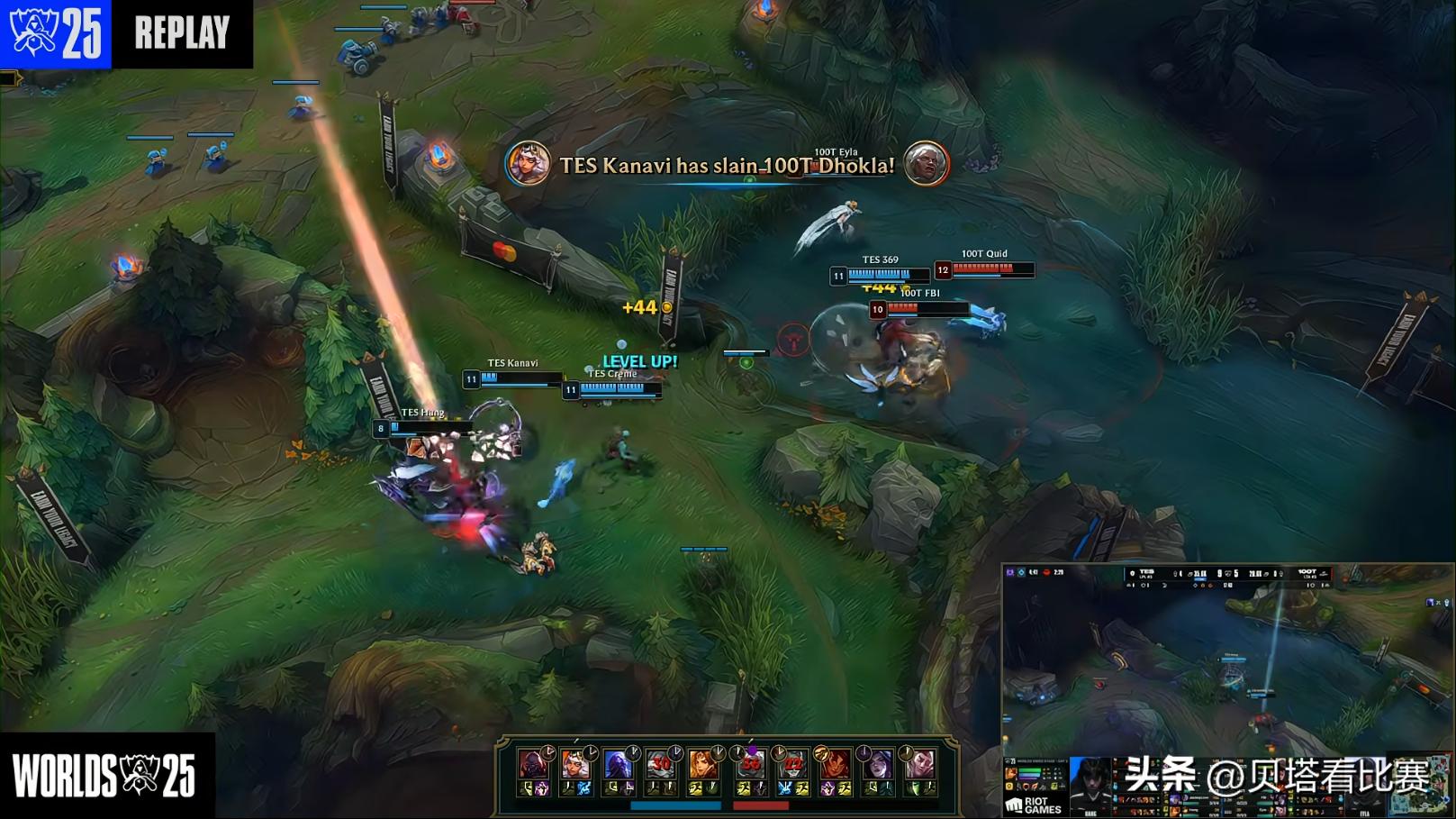 At the start, Kanavi's Qiyana ganked mid, killing Quid's Taliyah, and Creme's Ryze secured first blood. Meanwhile, 100T counter-ganked top, killing 369's Sion and getting a kill in return. At 14 minutes, TES caught and killed Aphelios bot, while 100T killed Kanavi in the jungle, but 369's Sion ult support turned the fight around, allowing TES to trade 1 for 4 and then take down the first mid turret. TES pushed down three towers early, secured two dragons, and led the economy by 5k gold. At 17 minutes, a jungle skirmish broke out; 369's Sion tanked upfront, and although JKL's Yummi died, TES traded 1 for 3 and secured the dragon soul advantage.