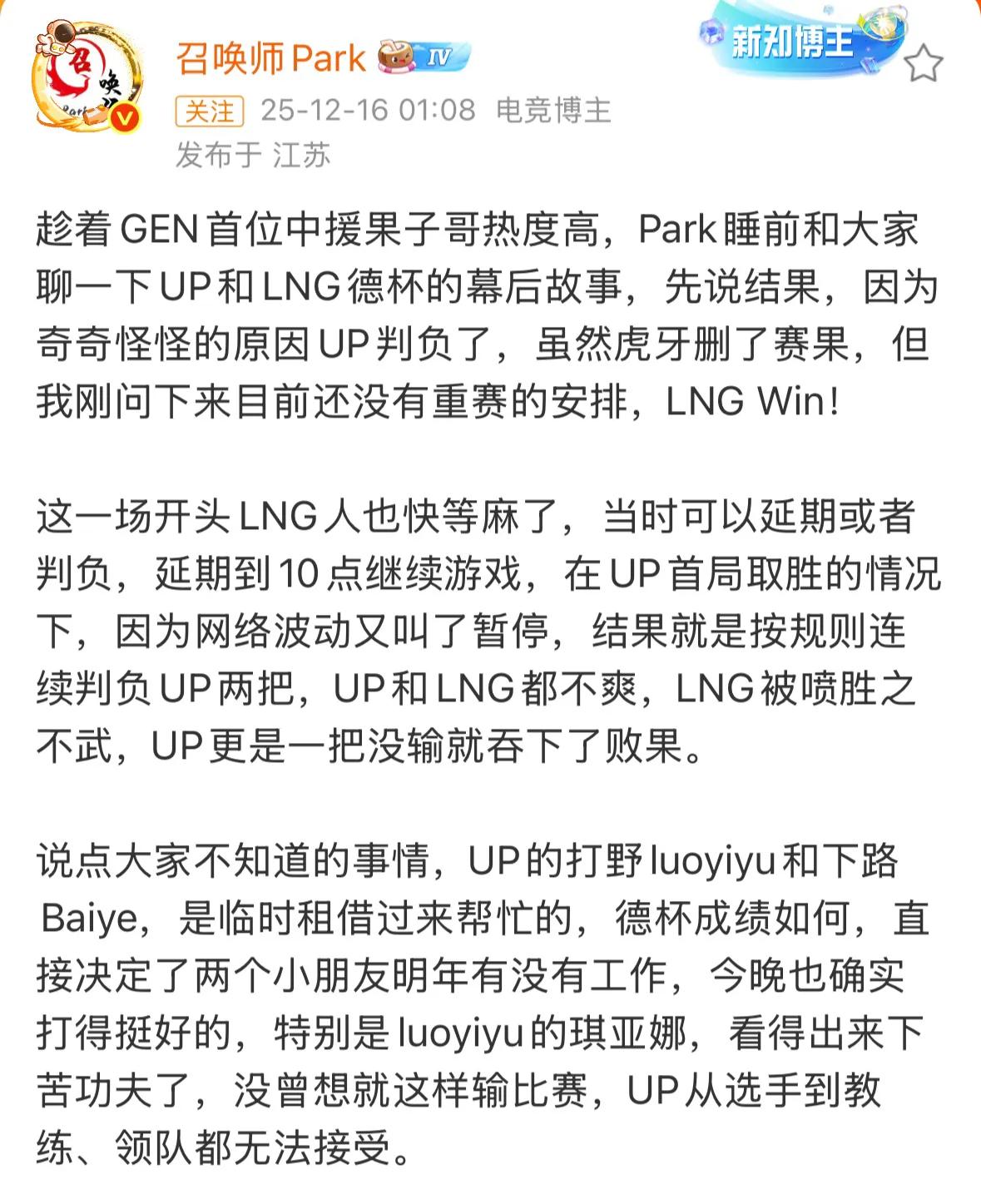 Let’s review what happened. The match between LNG and UP was originally scheduled around 7 PM, but officials announced that UP’s region experienced a catastrophic, uncontrollable network failure. Both the club and league responded promptly to investigate, finding the problem was with the local ISP, causing widespread network instability. Hence, the match was postponed from 7 PM to 10 PM. After one game resumed, network issues persisted severely. UP had to pause for too long again, frustrating LNG players who were waiting. Ultimately, the league applied rules that automatically handed a loss to UP, as they failed to be ready within 45 minutes past the official start time, resulting in a two-game forfeit loss.
