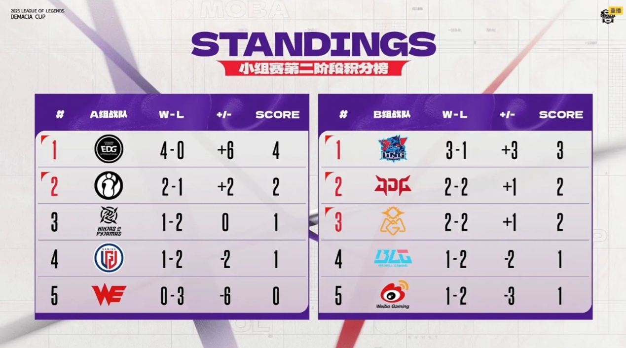 本屆德杯規則為兩個小組前三名晉級,B組的五支隊伍中,賽前被看好的三強為JDG、BLG和WBG,OMG與LNG實力稍顯不足,但實際對戰結果卻大不相同。