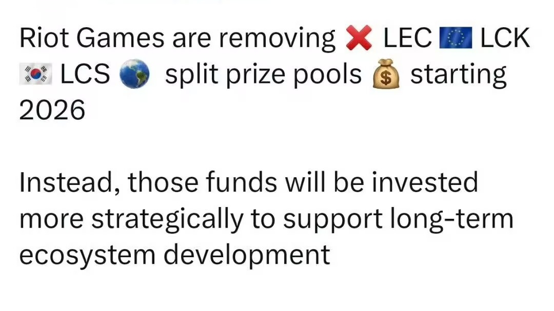 拳頭官方近日發文宣布:自2026年起,取消LEC、LCK、LCS三大賽區的獎金分配(LPL賽區保留),簡單來說就是拳頭不再發放獎金,即使奪得聯賽冠軍也無獎金可拿,原本以為我們賽區最難混,拳頭此舉讓LCK似乎比LPL更艱難,賽區本就難以盈利,獎金取消後成本更高了。