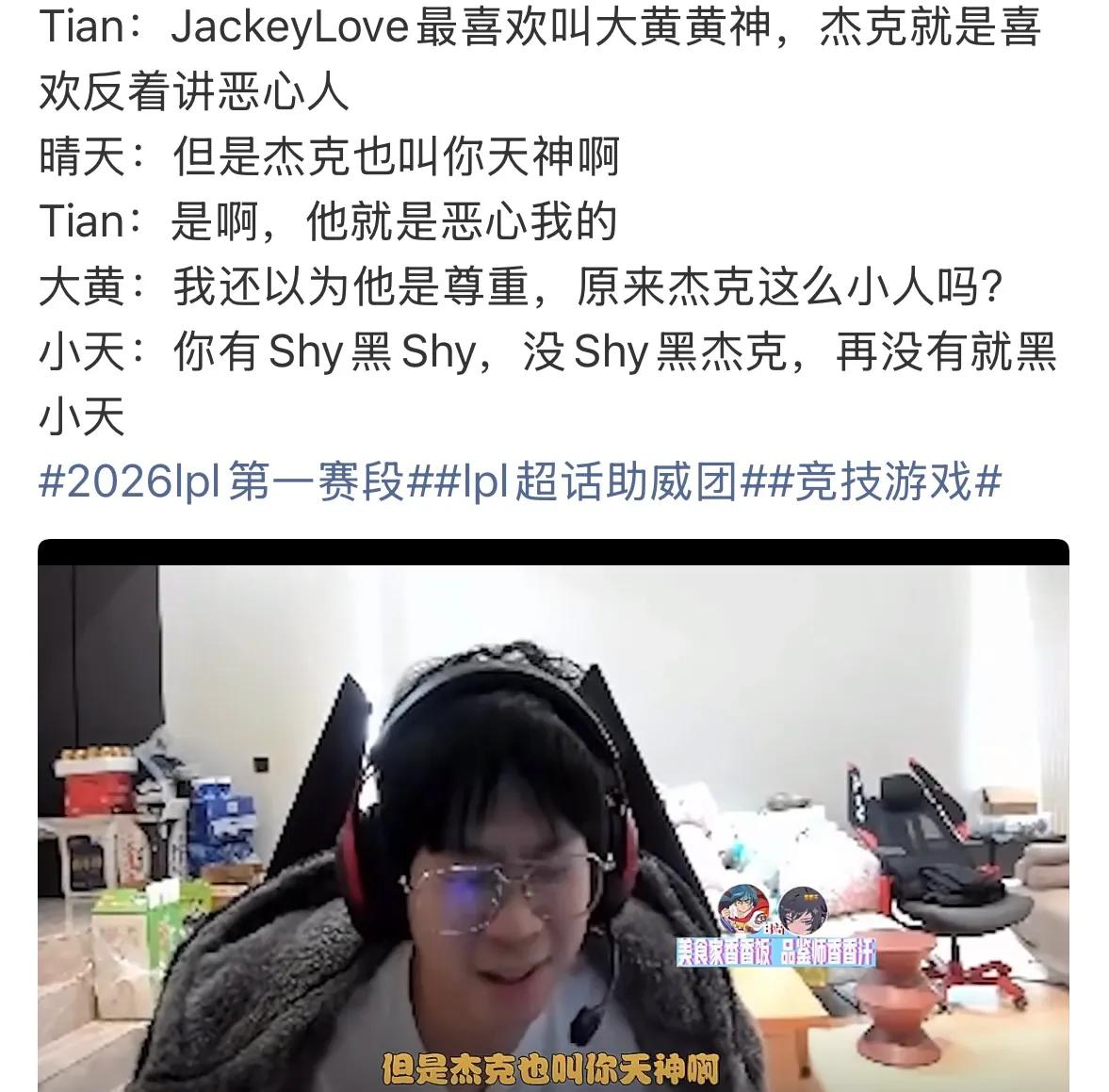 Tian: JackeyLove always calls Da Huang "Huangshen," but Jack loves to say the opposite to annoy people. Qingtian: But Jack also calls you "Tianshen." Tian: Yeah, that’s just to annoy me. Da Huang: I thought it was out of respect, but is Jack really that petty? Xiaotian: You have Shy who gets bashed, no one bashes Shy, but they bash Jack, and if no one else, then they bash Xiaotian. This statement quickly stirred widespread discussion across the internet. After all, these players were teammates who competed together and coordinated fairly well, with no prior rumors of internal discord. So why have they recently begun mocking A Shuo so openly?