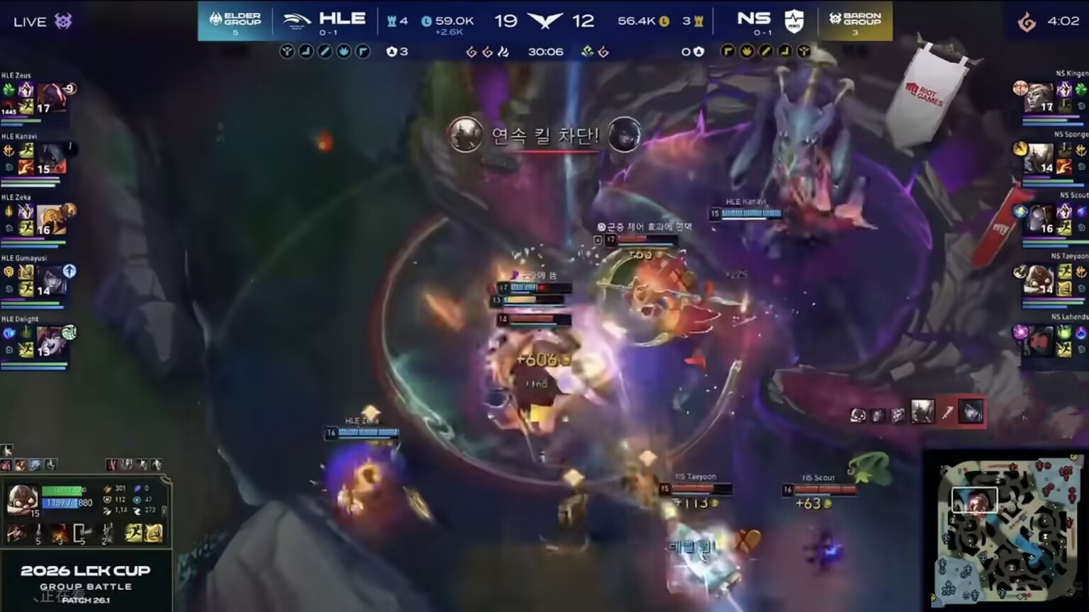 By 12 minutes, HLE was ahead by 2K gold, and Kanavi’s Aatrox was 3-0. With normal play, HLE shouldn’t lose. But watching the later team fights, craziness ensued. At 13 minutes, a fight broke out in the bot river; Kanavi’s ultimate took down three enemies but gave Scout a major kill. Later, during the Rift Herald fight, Kanavi went wild again, charging in 1v3 but dying, and NS secured the Herald.
