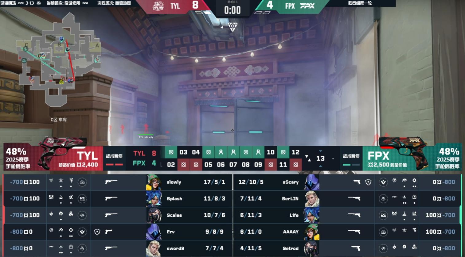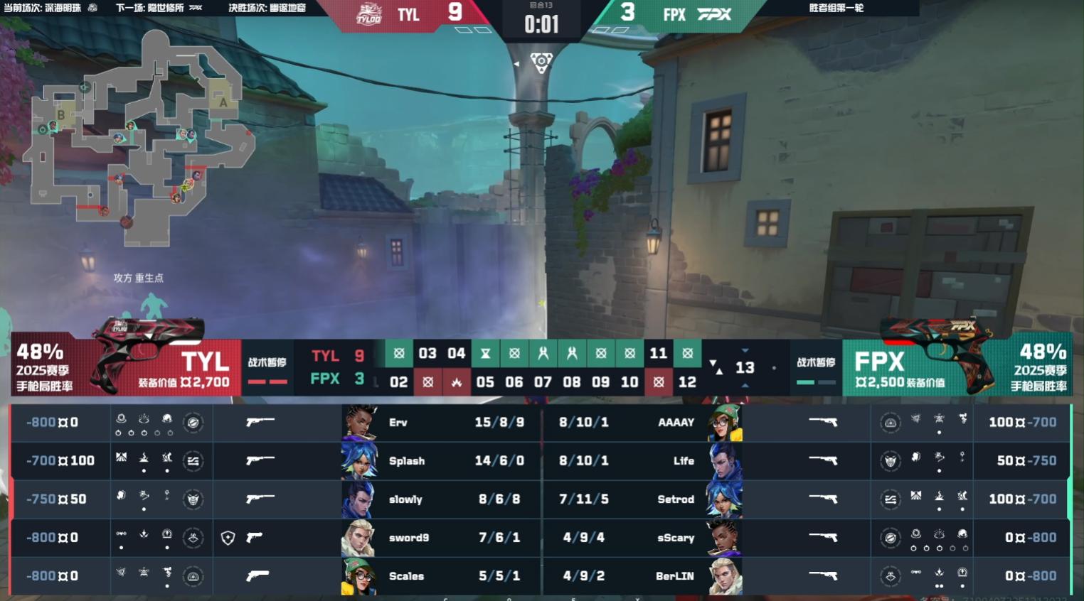 In the first half, Tianlu took the pistol round, and FPX secured a rifle round win in the third round with steady play. In round 6, FPX made an information error and was outplayed by Tianlu, who eliminated them all at point A. Round 7 saw FPX control mid and take out three from Tianlu, but without securing the spike; when they returned to plant, Tianlu’s two-against-four defense wiped them out. Tianlu strung together six consecutive wins. In round 11, during FPX’s eco round, they attacked point B but Life’s triple kill helped Tianlu secure a money-saving round comeback. Throughout the first half, Tianlu’s young players Splash and Erv showcased the fresh talent of VCTCN newcomers. The half ended with Tianlu leading 9-3 over FPX.