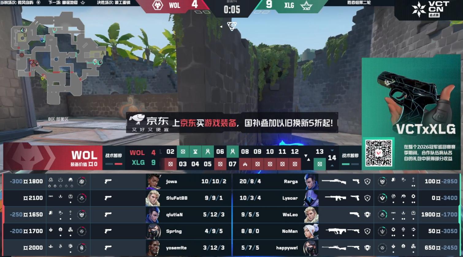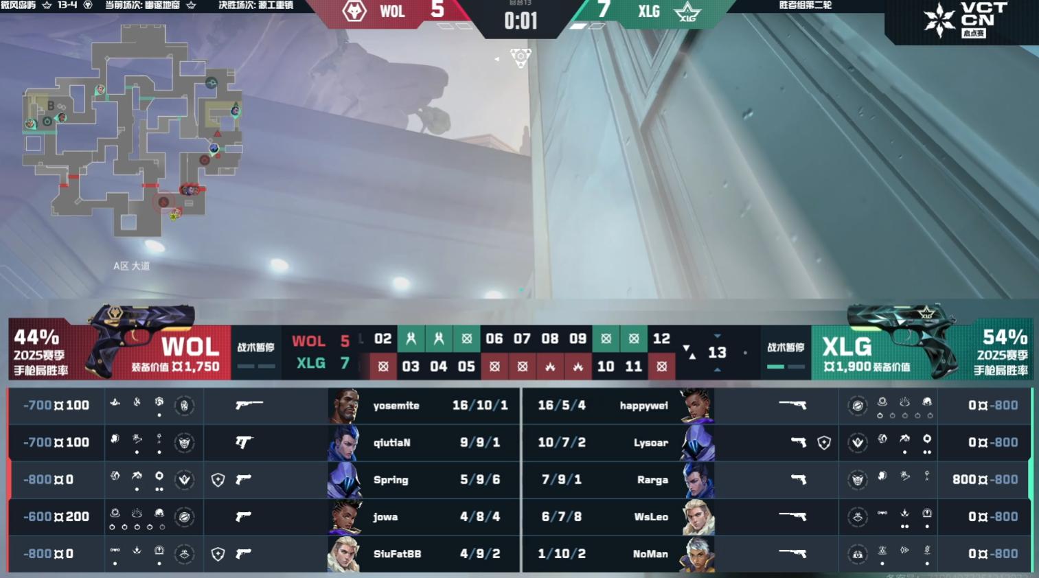 In the first half, Rarga led with a four-kill pistol round. In round 3 at site B, jowa used a smoke from a separated position to find space, securing a triple kill and the bonus round. Both teams focused differently on mid control; WOL emphasized mid control to retake defense during the bonus rounds, scoring three consecutive points. XLG called a timeout in round 6 to adjust their attack rhythm, then used a slow approach combined with a pincer move. In round 11, XLG executed a full rush on A site; WOL’s qiutiaN tried to flank with ultimate but failed, resulting in WOL losing the point. After adjustments, XLG regained control of the attack pace and scored eight points, while WOL managed only four in the first half.
