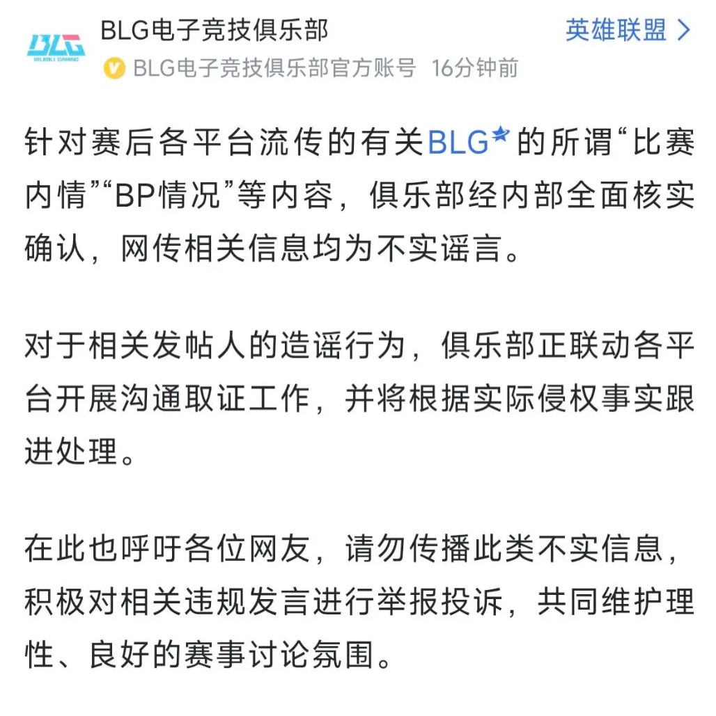 BLG’s official account saw this and immediately took strong action, issuing a statement denying the rumors about internal BP issues circulating online, and said they had contacted the poster to gather evidence and would handle the situation accordingly.