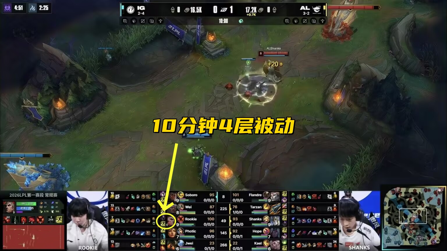 Shanks picked Galio first, and Rookie countered with Ryze. Despite having range advantage, Rookie failed to exert any pressure and was even forced to use his ultimate before the dragon fight, preventing IG from contesting the dragon. The strangest part was that after 10 minutes, Rookie had only stacked 4 passive charges on Ryze. Ryze’s E or W hits add a stack, and Galio’s E can negate Ryze’s second E, but 4 stacks are really too few.