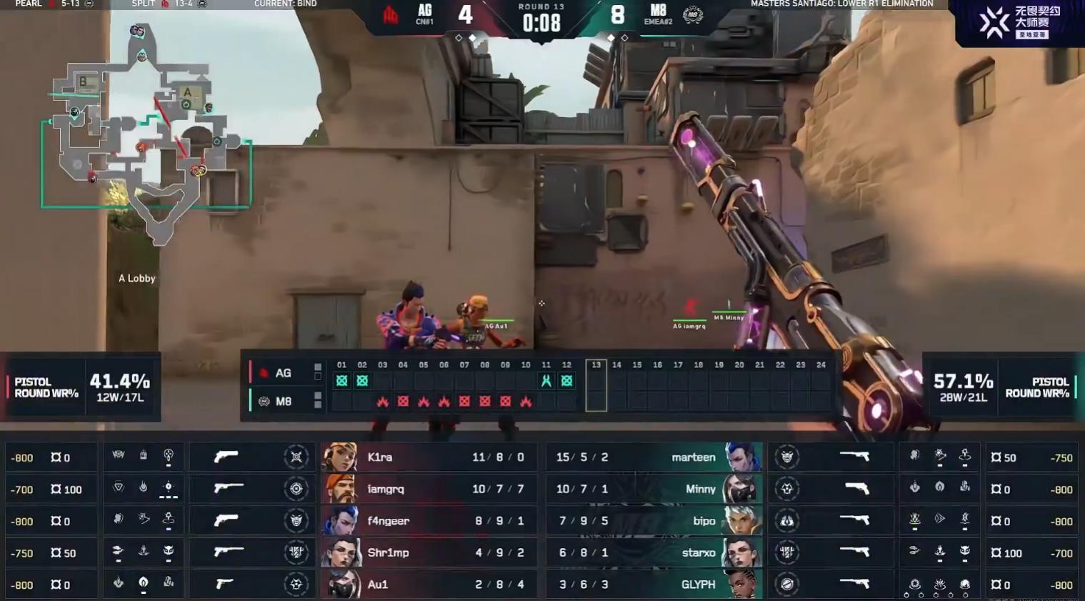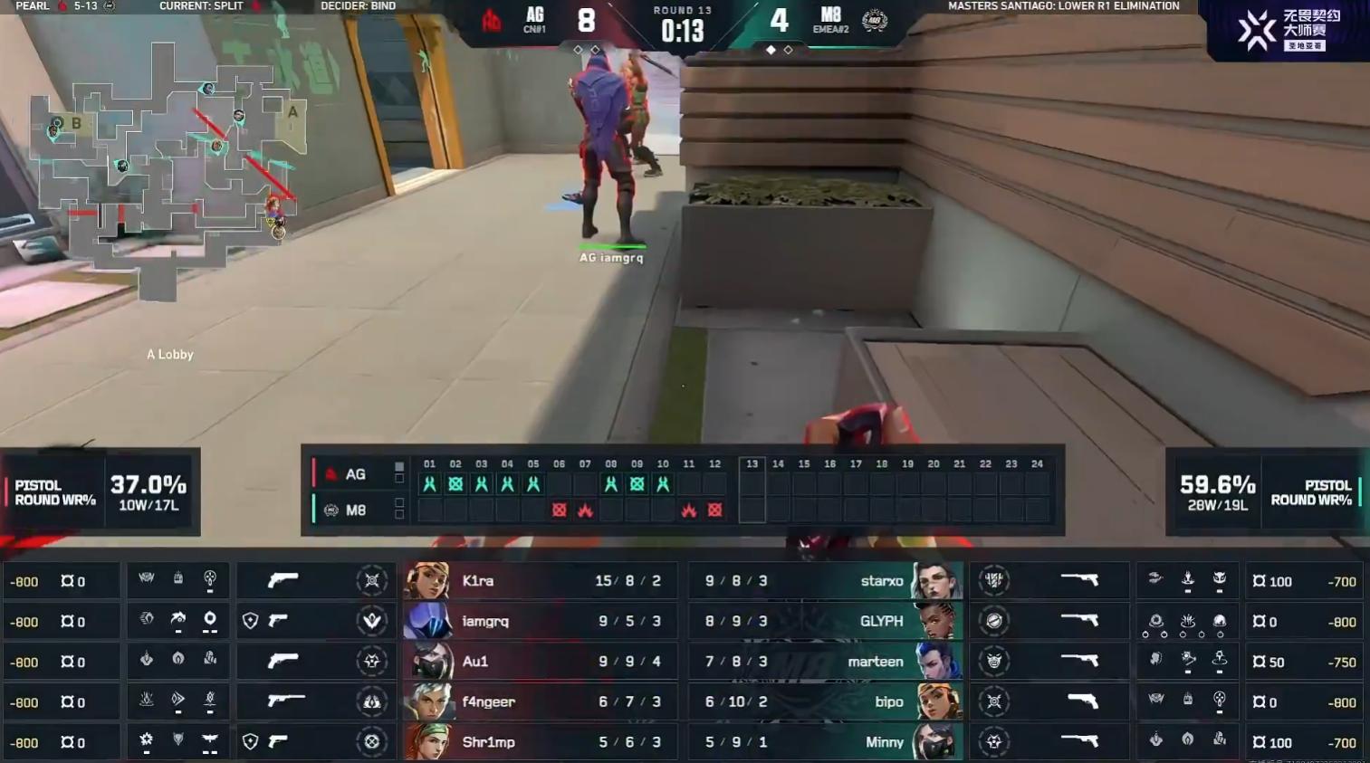 M8 secured four consecutive rounds. In round 18, AG's rush on A was completely stopped by M8. M8 won Map 1 13-5.
