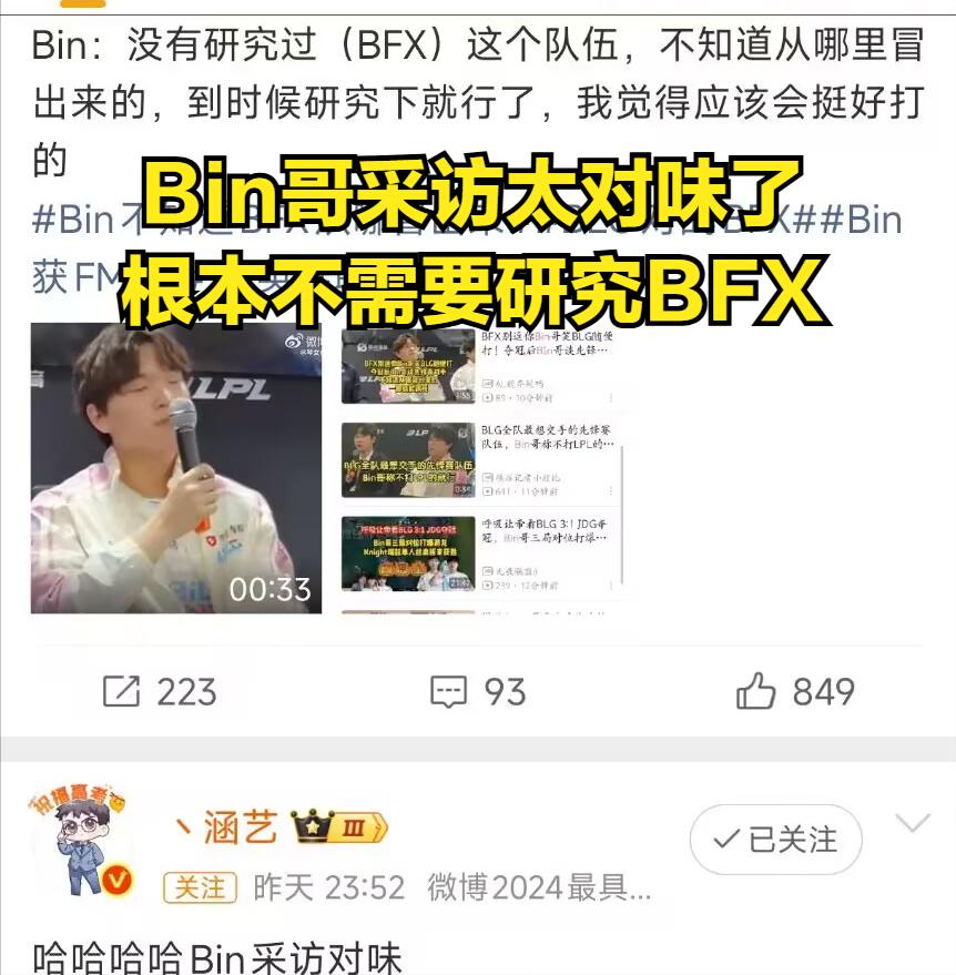 Besides calling out Kiin during the interview, Bin also expressed disregard for LCK's second seed BFX. Bin mentioned that he had never heard of this team and didn't know where they came from. Even if BLG doesn't study them, BFX likely cannot defeat BLG. It must be said that Bin's remarks are "very characteristic." Many Bin fans joked that BLG's current goal is to defeat GEN, and since BFX was beaten by GEN in the finals, they indeed don't deserve Bin's attention.