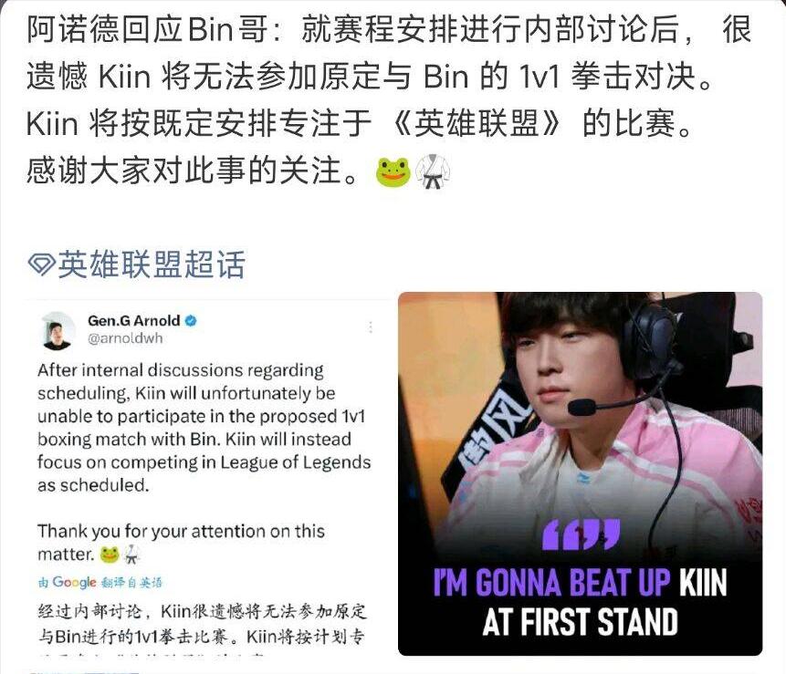 Many viewers turned into amused spectators, hoping that GEN's management would arrange a showdown between GEN's top laner Kiin and Bin. Some even anticipated a private boxing match between Bin and Kiin, given Bin's claim of wanting to beat Kiin. As numerous fans voiced their demands to GEN, GEN's owner Arnold specifically addressed the issue. GEN's owner stated that according to GEN's official schedule, Kiin is heading to the Pioneer Tournament soon, so Kiin cannot participate in a 1v1 boxing match with Bin.
