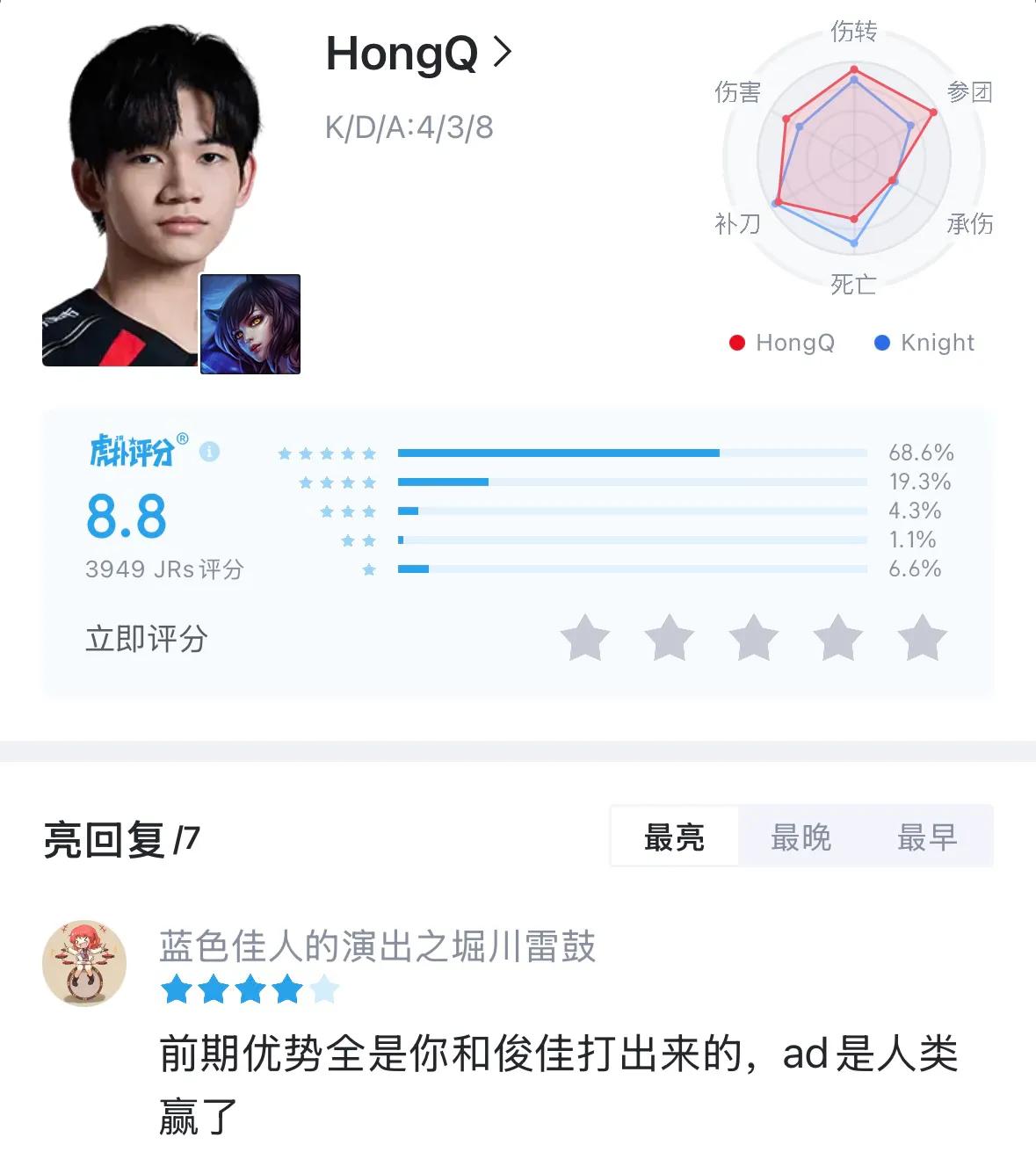 Only 19 years old and having been in the top-tier league for just one year, his achievements so far are quite dazzling. From being unrecognized at the start of the season to now shining brightly, Hongq has truly proven himself through one match after another. However, honestly, his recent match intensity has been somewhat high. Next, they will face Gen.G team directly, whose mid-lane player is the well-known Chovy. Unless unexpected, he might be overwhelmed. But for Hongq, this is undoubtedly an excellent opportunity for growth. It depends on how JDG team polishes him; with Tabe present, issues are likely manageable, as he is the head coach who has consecutively led four different teams to the World Championship.