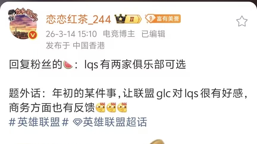 Tian's former teammate Liu Qing-Song recently has rumors of returning. Hong Cha透露: "Shao" has two clubs to choose from. Additionally, this year Liu Qing-Song refused to switch to DOTA, saying he relies on League for his career, which gained favor with official management. The two teams chasing him are easy to guess: first, the team must be strong, at least top 5 in LPL; second, the team's辅助 performed poorly in the first stage.
