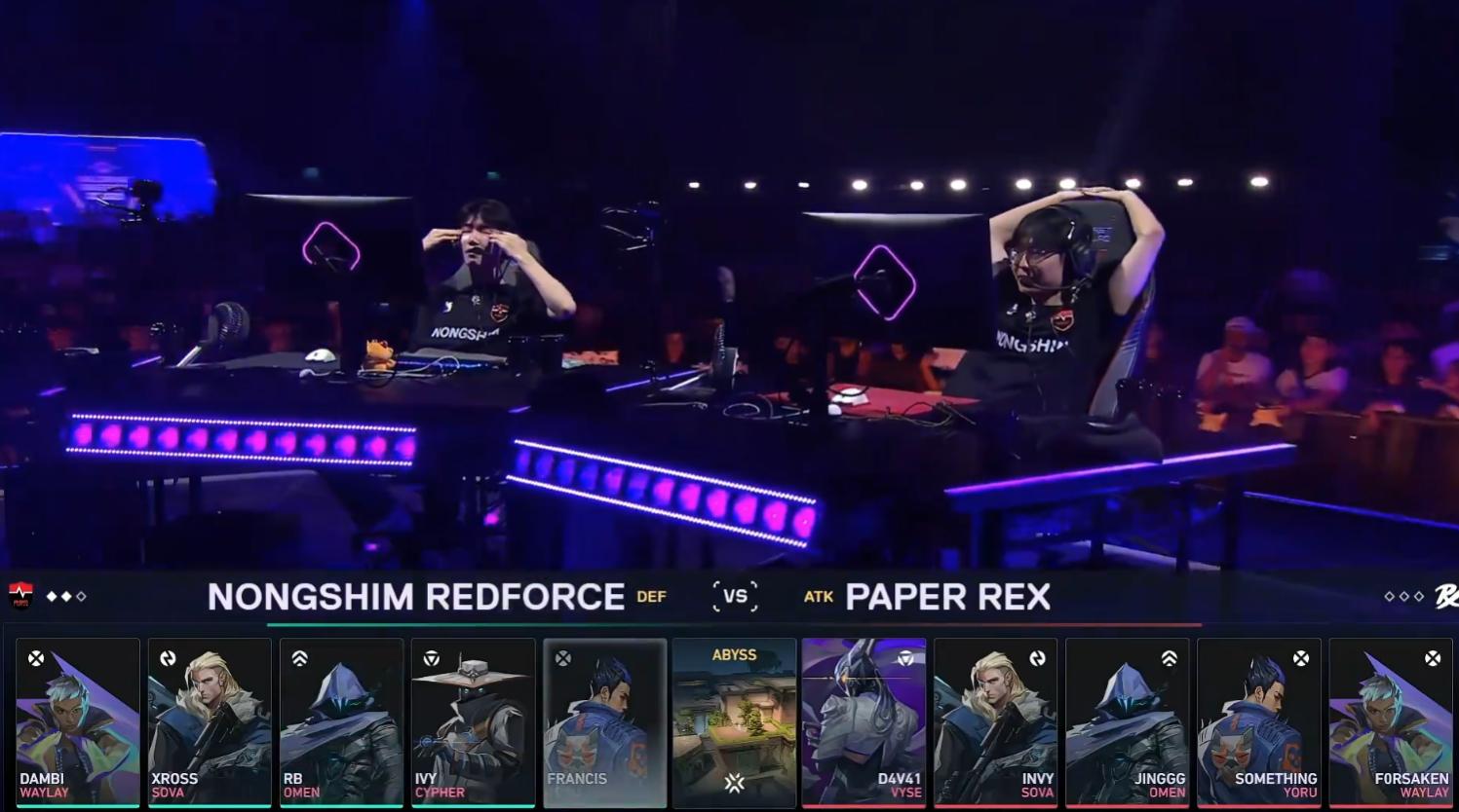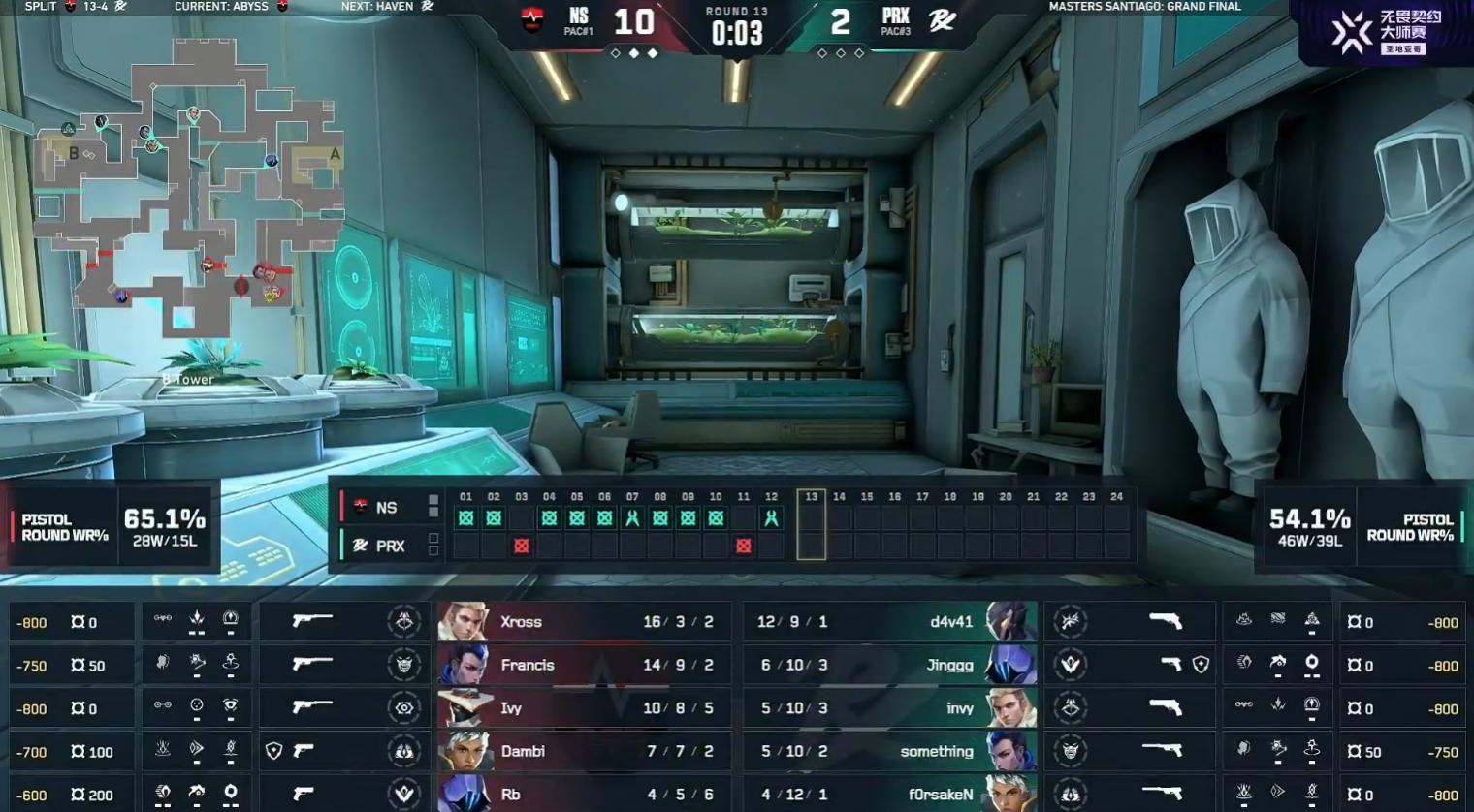 The second half, PRX won the pistol round, but the following round, NS controlled mid and then defeated PRX at point B, NS scoring a comeback round. NS won three consecutive rounds, claiming Abyssal Cavern 13-3.