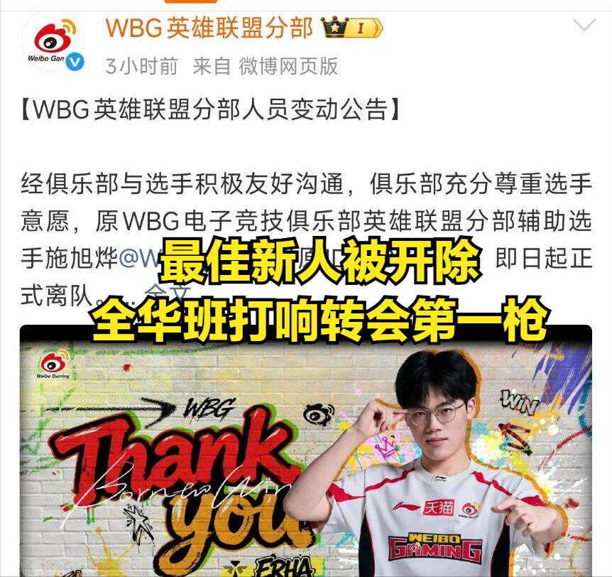 雖然LPL第二階段轉會期已進行一段時間,甚至不少LOL圈內知名人士已開始公開披露各隊轉會資訊,然而LPL各隊伍卻似協商一致,無人提前官方宣布自家轉會結果。隨著LPL第二階段賽事即將展開,終於有隊伍率先發布公告,公開自家轉會成果,此隊伍便是LPL全華班WBG戰隊,他們於轉會期間的調整極為簡潔,即直接解約輔助選手erha。