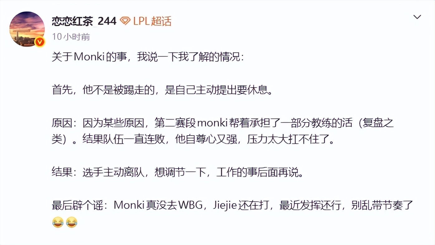 With strong self-esteem and the team failing to achieve results, Monki couldn’t bear the pressure and voluntarily requested a break. Honestly, Chaoxiong has skill, but his current teammates are too weak. They couldn’t gain lane advantages, and when he tried to invade to open up the game, the opponents always supported first, leading to him being caught and crushed. Given the team’s current situation, achieving good results is unlikely. Taking a break to adjust his mindset is actually a good thing.