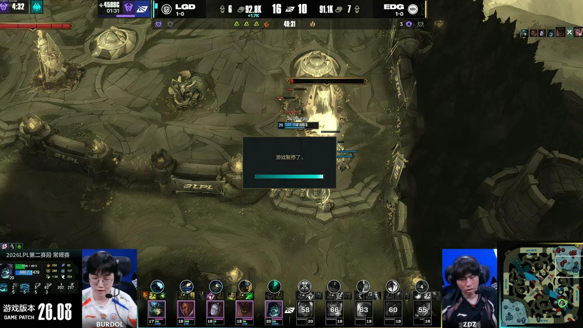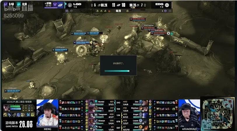 After failing to push at 48 minutes, LGD called a pause during their pursuit. Following the countdown, Malphite instantly ulted, combined with Orianna's ball, pulling three EDG members. Even commentator Zitai remarked during his stream that LGD's tactic was truly sneaky. Although no kills were secured, multiple crucial flashes from EDG were burned, impacting the final Elder Dragon pit fight. They had no skills left to evade Malphite's second ult. After all players died, EDG called a pause, but it was futile. No time reversal occurred even after over ten minutes, and LGD ultimately won this messy, "feeding" match 2-0.
