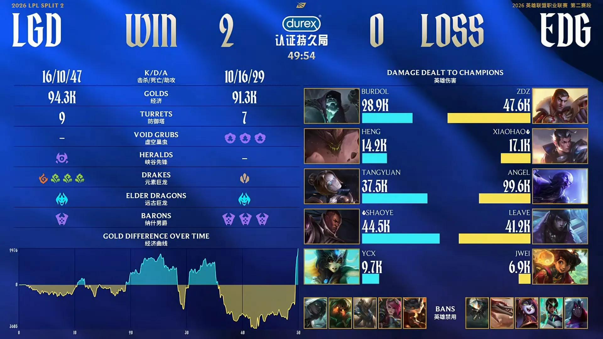 The main discussion likely revolves around the second game, where both sides fought fiercely, resembling anything but a professional match—it didn't even feel like a ranked game, featuring multiple base flip-flops. At 11 minutes, EDG launched an attack in the bot lane, killing the enemy Malphite and then taking down the support Nami, achieving a one-for-two trade. Later, LGD also secured several kills, but EDG maintained the advantage. At 29 minutes, EDG initiated a mid-lane fight and secured Baron. At 35 minutes, EDG stole the second Baron, won the team fight decisively, and subsequently killed the Elder Dragon, achieving a double dragon buff. It seemed they would end the game in one push, but EDG performed poorly. Then the match entered a prolonged stalemate.