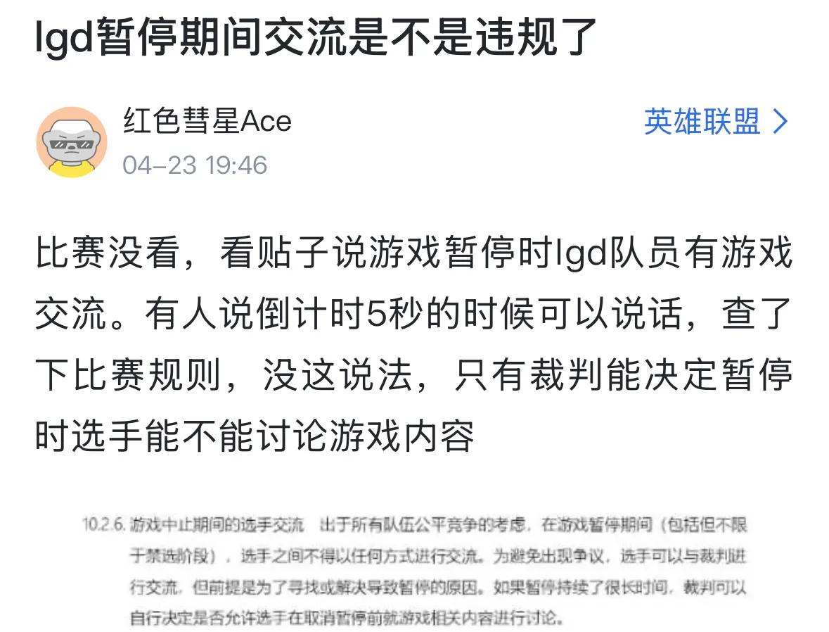 After the match, many fans debated whether LGD communicated via voice during the pause. Some claimed that players can talk during the five-second countdown, but others checked the rules and found no such provision. Only referees can decide whether players can discuss game content during a pause. Official announcements will clarify the situation, as the match is over and cannot be overturned. If there was a violation, likely only fines would apply. It depends on whether there is a rule allowing communication during the five-second countdown. Of course, it's also possible that LGD players did not communicate, and netizens misinterpreted the situation.
