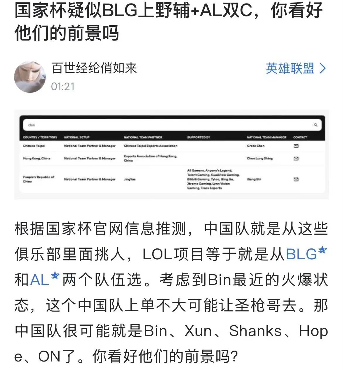 Perhaps many netizens are not particularly focused on this competition. The first Esports National Cup (ENC) will be held in November, and the matches between national teams will be exceptionally exciting. The League of Legends matches between the Chinese and Korean teams are the highlight, and this has been one of the most fiercely contested events over the years. Previously, industry insiders discussed the lineup for the Chinese team in the Esports National Cup. Among the ten clubs mentioned, only AL team and BLG team are top-tier domestic League of Legends divisions, and this competition only allows Chinese players to participate, including top-laners Saint Gun, Bin, jungler Xun, mid-laners Knight, Xiangkes, AD Hope, and support On.
