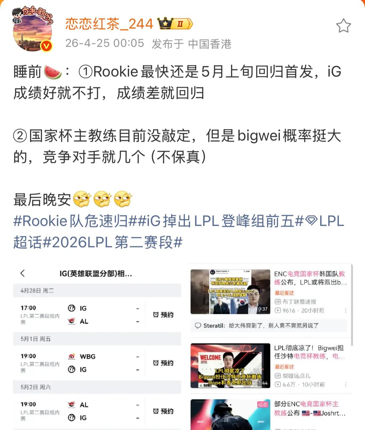 Moreover, industry insiders also revealed that the head coach for the National Cup has not yet been finalized, but Bigwei has a high probability, with only a few competitors. Although there are explanations that the information may not be entirely reliable, all industry news tends to have some basis. If Bigwei becomes the head coach, it would indeed be concerning. His coaching performance is well-known; during his tenure at AL team, he led the team to a plummeting ranking. Additionally, the return time for mid-laner Rookie was disclosed: he may return to the starting lineup as early as mid-May. If IG performs well, he might not play; if performance is poor, he is likely to return.