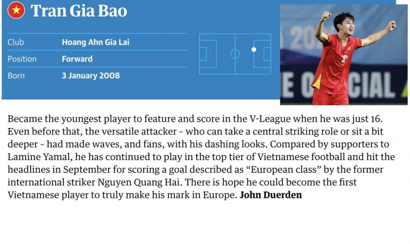 Accordingly, The Guardian has included Trần Gia Bảo, a young striker from HAGL, in this list. Holding the record as the youngest player to score in V-League history on his debut, Gia Bảo also made waves with Vietnam's U17 team by scoring against Japan U17 in a 1-1 draw.