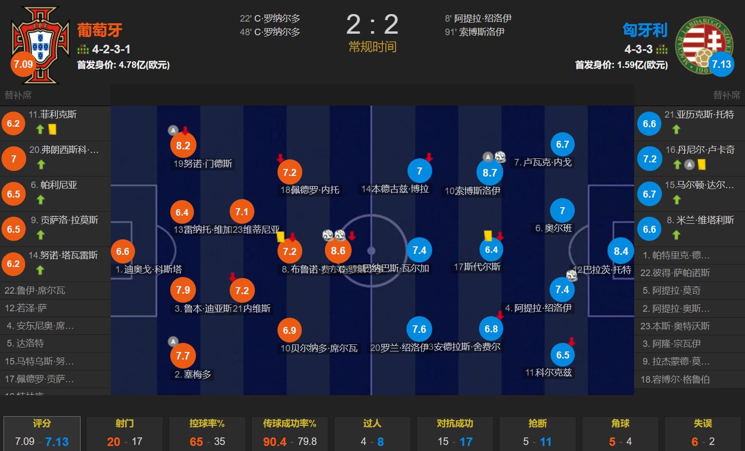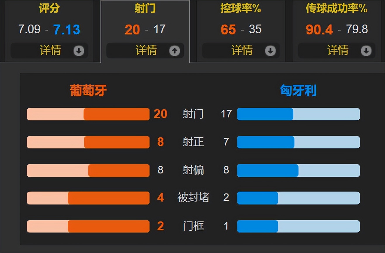 In terms of match statistics, the two teams were fairly evenly matched, with Portugal’s €979 million squad having no clear advantage. Portugal held 65% possession, took 20 shots with 8 on target; Hungary had 17 shots with 7 on target. Apart from possession, the shots and shots on target were very close, making the 2-2 scoreline a reasonable outcome.