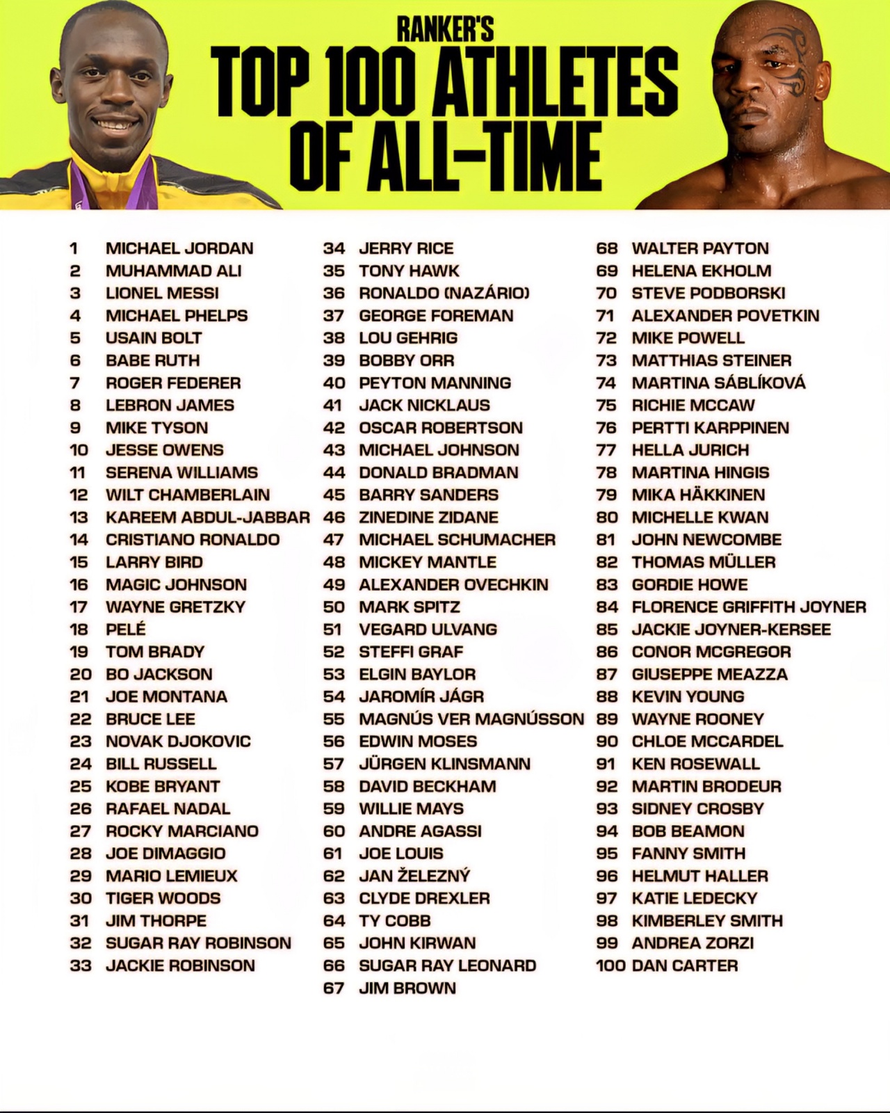It can only be said that foreign media Global Statistics’ top 100 athletes list is somewhat glorified, reflecting influence in the U.S. rather than pure ability. The three football kings, Messi, Pelé, and Maradona, are undeniably legendary. What’s your opinion on the Global Statistics top 100 athletes list?