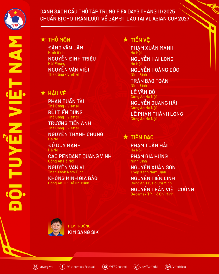 On November 6th, head coach Kim Sang Sik announced the list of 23 players for the Vietnam national team to prepare for the match against Laos in the second leg of the final round of the 2027 Asian Cup qualifiers. The team will gather on November 10th in Viet Tri (Phu Tho) and is expected to travel to Laos on November 15th.