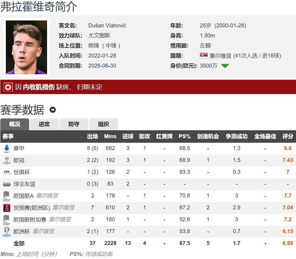 Juventus has revealed that their forward Vlahović suffers from a high-grade injury at the connection of the left rectus femoris muscle and tendon. Italian journalist Di Marzio reported that Vlahović will be sidelined for at least 2-3 months, with a longer absence if surgery is required. Since Serbia has missed out on the 2026 World Cup in the USA, Canada, and Mexico, surgery is less problematic. Vlahović’s contract with Juventus ends this season, and the club will not renew it due to his high salary.